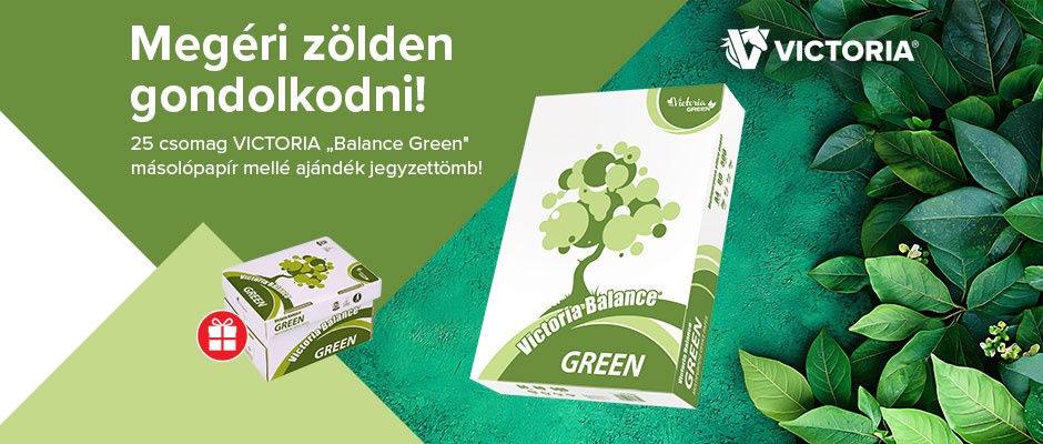 Vásároljon 25 csomag (5 doboz) VICTORIA Balance Green másolópapírt, és ajándékba adunk egy Victoria Balance Green jegyzettömböt.